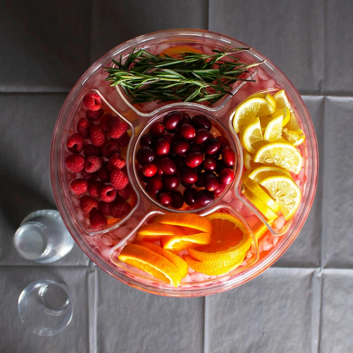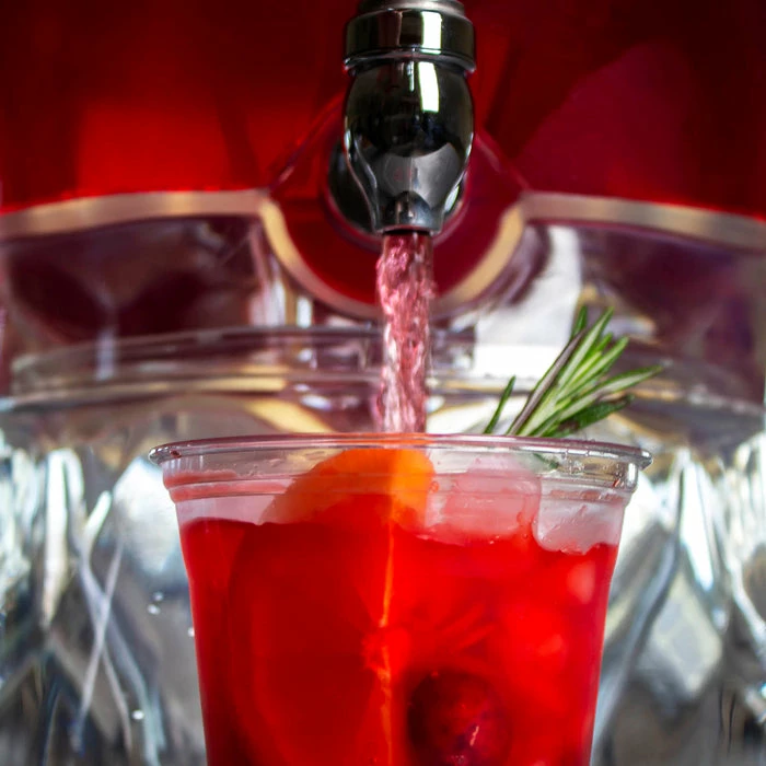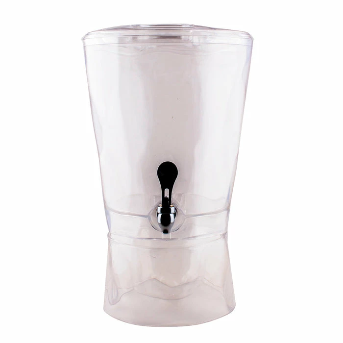 This 3.5 gallon BPA free acrylic beverage dispenser is a great and modern way to serve drinks at your next event! The dispenser is perfect for any beverages such as: punch, tea, or even a cocktail mixture.ย It comes with a removable lid that also serves as a garnish server. Has a built in strainer by the spoutย to ensure easy no clog dispensing. The large lever spigot is made of a heavy duty chrome plated metal. Has a built in ice reservoir underneath the beverage to provide additional cooling.ย