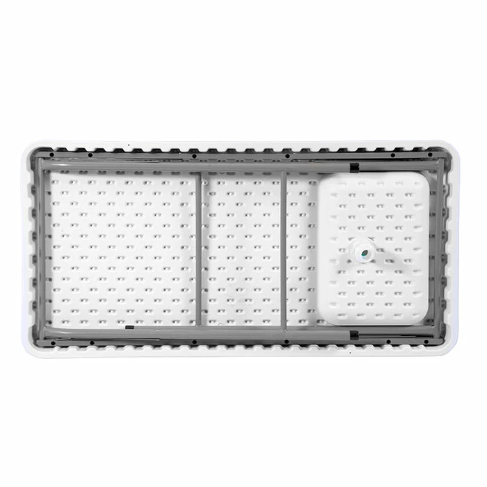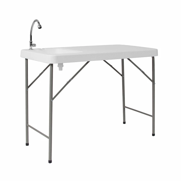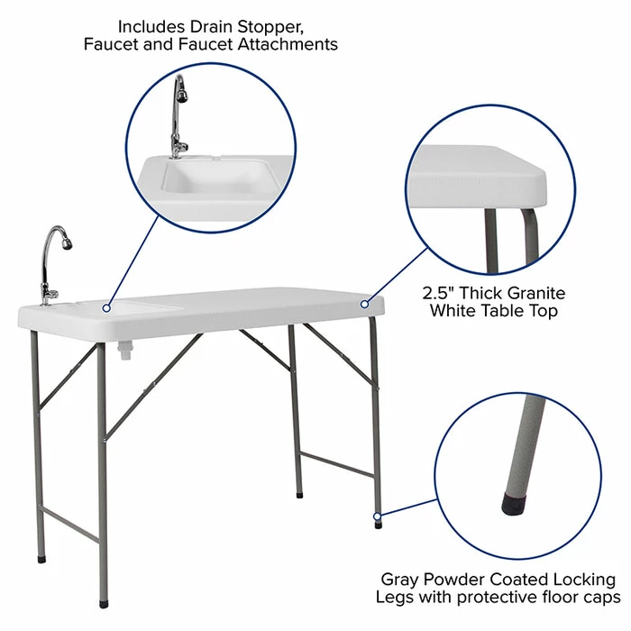 Thick white granite portable table with sink. Includes drain stopper, faucet and faucet attachments. Ideal for camping, canning vegetables and fruits or outdoor events. Sink measures 11.50″W x 16.25″L x 3″H. Table measures 23″ W x 45″ L x 34″ H and table top thickness is 3″.