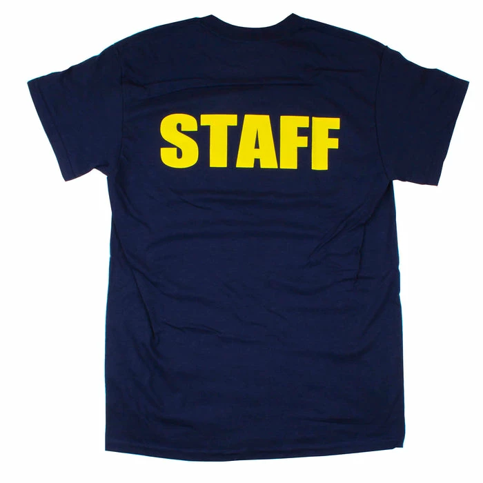 If you need your staff team to be easily spotted and identified during events, you must have them wearing the same style uniform, like these professional looking tees. These Navy Blue short sleeve t-shirts are screen printed with the word STAFF on the front and back in high contrast Yellow. These tees are made of preshrunk, 100% cotton for comfort and durability. Available in Small, Medium, Large, X-Large, and X-Large.