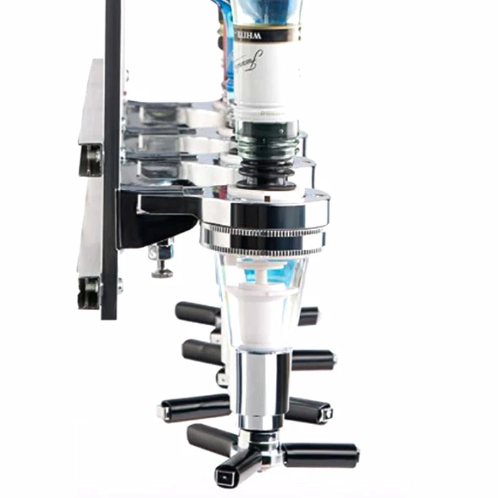 Final Touch Wall Mounted 4 Bottle Liquor Dispenser. The slim aluminum profile allows this dispenser to be installed almost anywhere, freeing up your shelf space. The spring holders with rubber tops ensure a snug hold on any bottle 13โ (33cm) tall or less. Each dispenser is leak proof and measures out 1.5 oz shots every time. Simply load the bottles and place glass directly under the dispenser, then simply push up on the trigger and let gravity do the work! Easy to install and use. Measures 14โ W x 14โ H x 4 ยฝโ D.