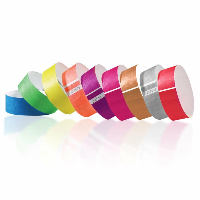 Club owners and party managers use colored, numbered wristbands to track door profits, drinking ages, and VIPs. This wide range of selection features 1 inch wide bands made of strong, waterproof Tyvek® material and come in several colors and designs. All come in self-dispensing boxes of 500. Keep your door honest and your count accurate by alternating colors for different nights or events and utilize the number count system. Band come in solid colors, a star pattern, and a decorative sun pattern.